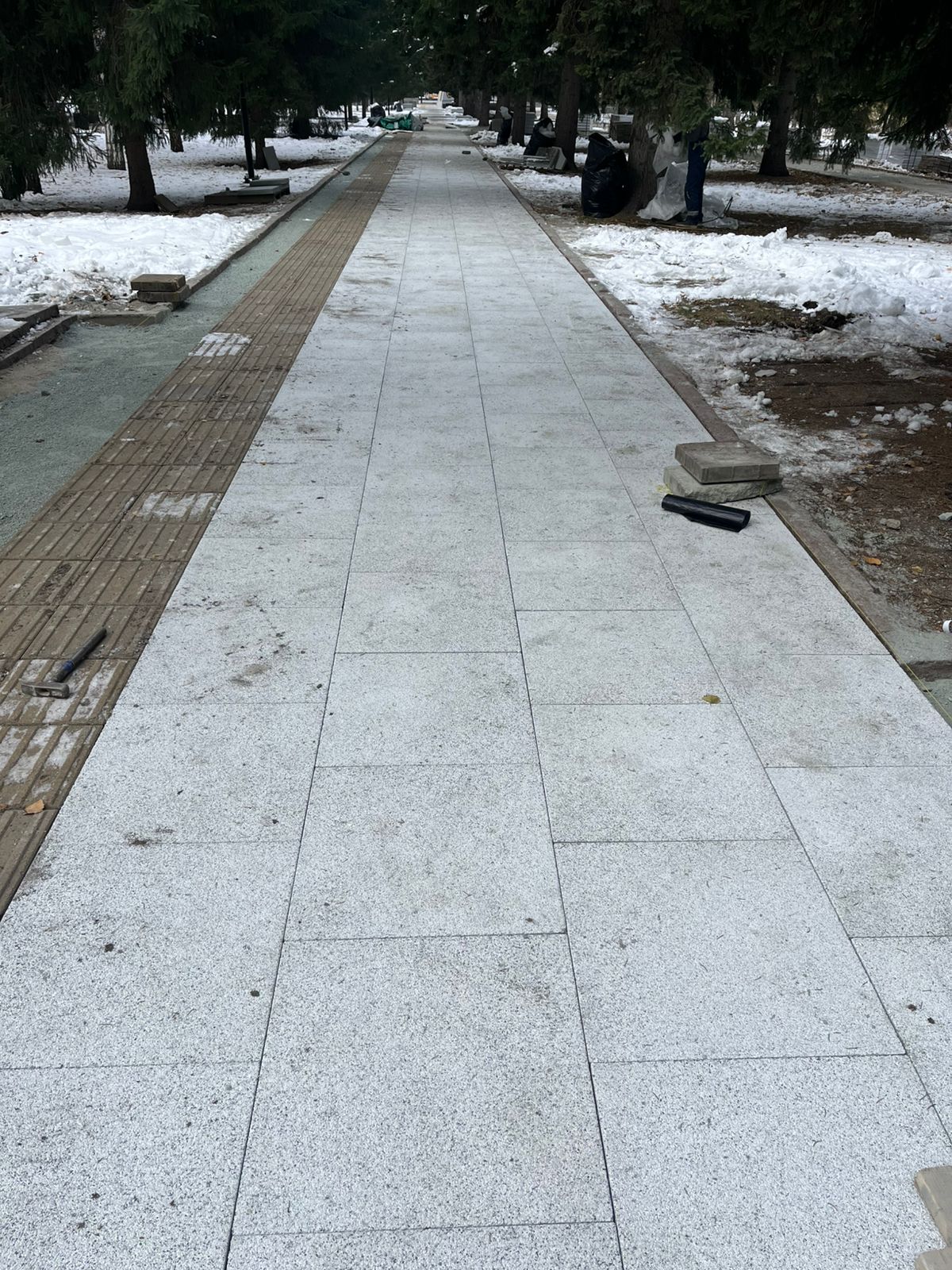 Монумент Славы - объект культурного наследия, который находится под архитектурным надзором, поэтому все материалы подбираются с учетом цветовой гаммы и фактуры, схожими с историческими. Правило касается не только самого памятника, но и прилегающих пешеходных дорожек – для устройства покрытия используют тротуарные плиты «Ревертек» формата 500х500 с фактурой белый мрамор.