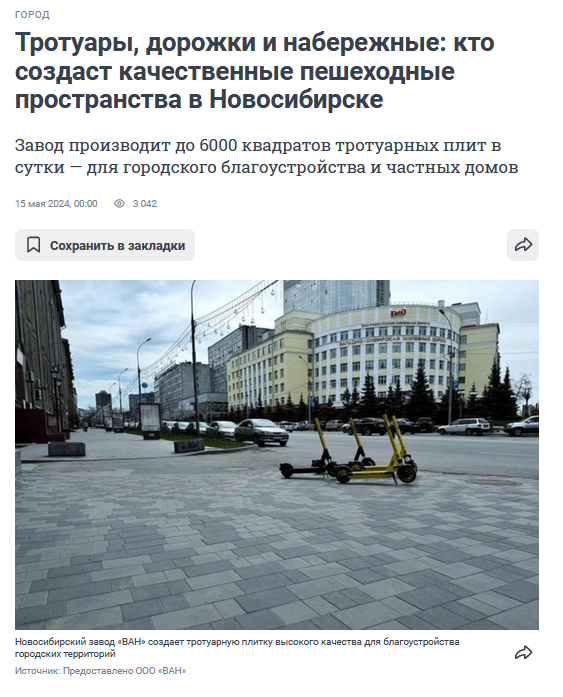 Важно не только возводить новые микрорайоны, но и качественно менять городскую среду. Зеленые парки и скверы, облагороженные набережные и бульвары, широкие и удобные тротуары — все это важные компоненты благоустройства, формирующие благоприятную социальную обстановку. Свою лепту в развитие пешеходной инфраструктуры города вносит новосибирский завод «ВАН», где производят тротуарные плиты европейского качества.