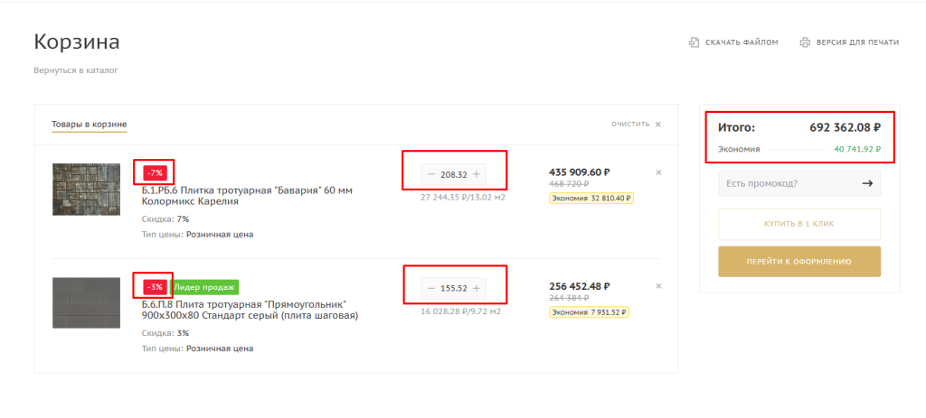 Пример автоматического расчета объемной скидки в Корзине (в зависимости от коллекции плит):